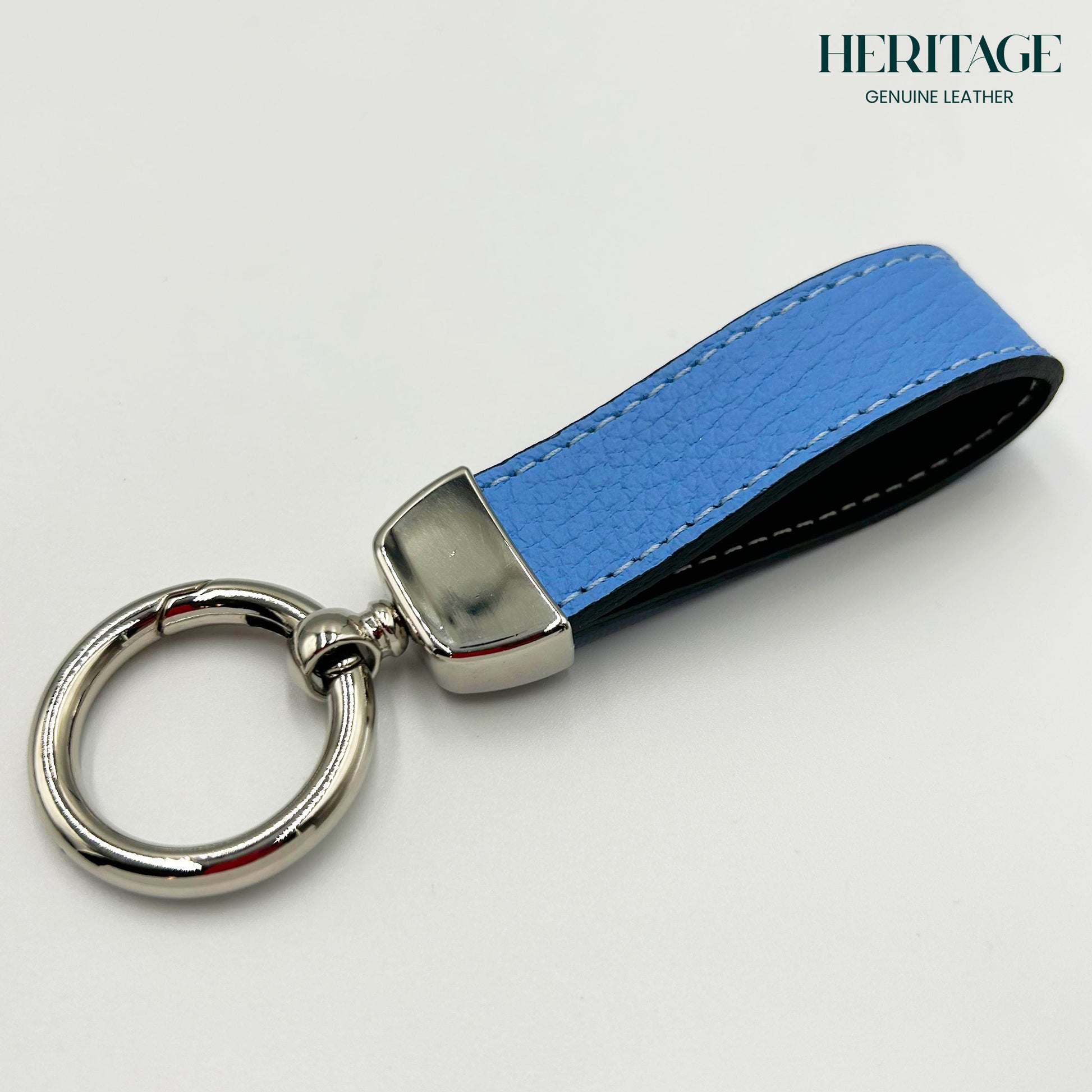 Llavero Metálico Plata con Correa en Cuero Granulado Celeste Heritage
